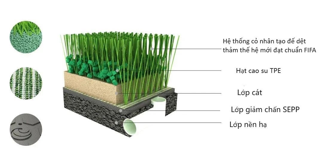 H? th?ng c? nhan t?o ?? d?t th?m th? h? m?i ??t chu?n FIFA t? AVG?(kh?ng tráng keo)????c FIFA ch?ng nh?n?và áp d?ng c?ng ngh? hàng ??u th? gi?i,????c trang b? l?p gi?m ch?n SEPP?th? h? m?i có tính??àn h?i cao và h?t?cao su?TPE than thi?n v?i m?i tr??ng, kh? n?ng h?p th? tác ??ng c?a h? th?ng ??t h?n 60%.