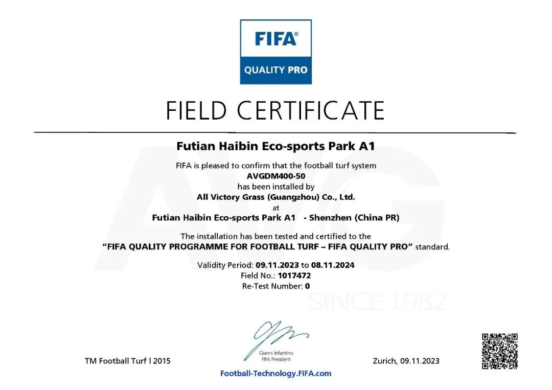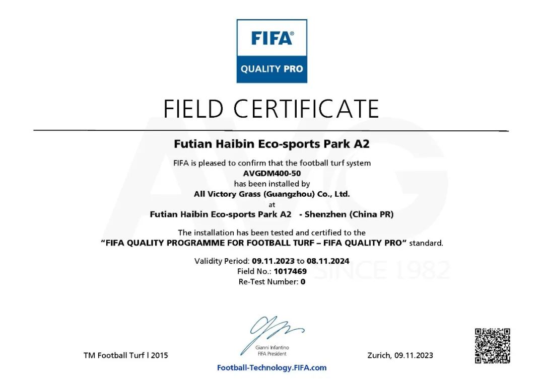 Trong s? ?ó, c?m 2 san bóng?s??A1, A2 c?a C?ng viên th? thao sinh thái ven bi?n Phúc ?i?n (Futian)?Tham Quy?n ?? giành ???c?Ch?ng ch? san bóng ??t chu?n FIFA ? c?p ?? cao nh?t và ???c c?p?ch?ng nh?n FIFA QUALITY PRO. San bóng c?a Tr??ng Th?c nghi?m Yuyan ? qu?n Hoàng Ph?, thành ph? Qu?ng Chau c?ng ??????c?c?p?ch?ng nh?n FIFA QUALITY.